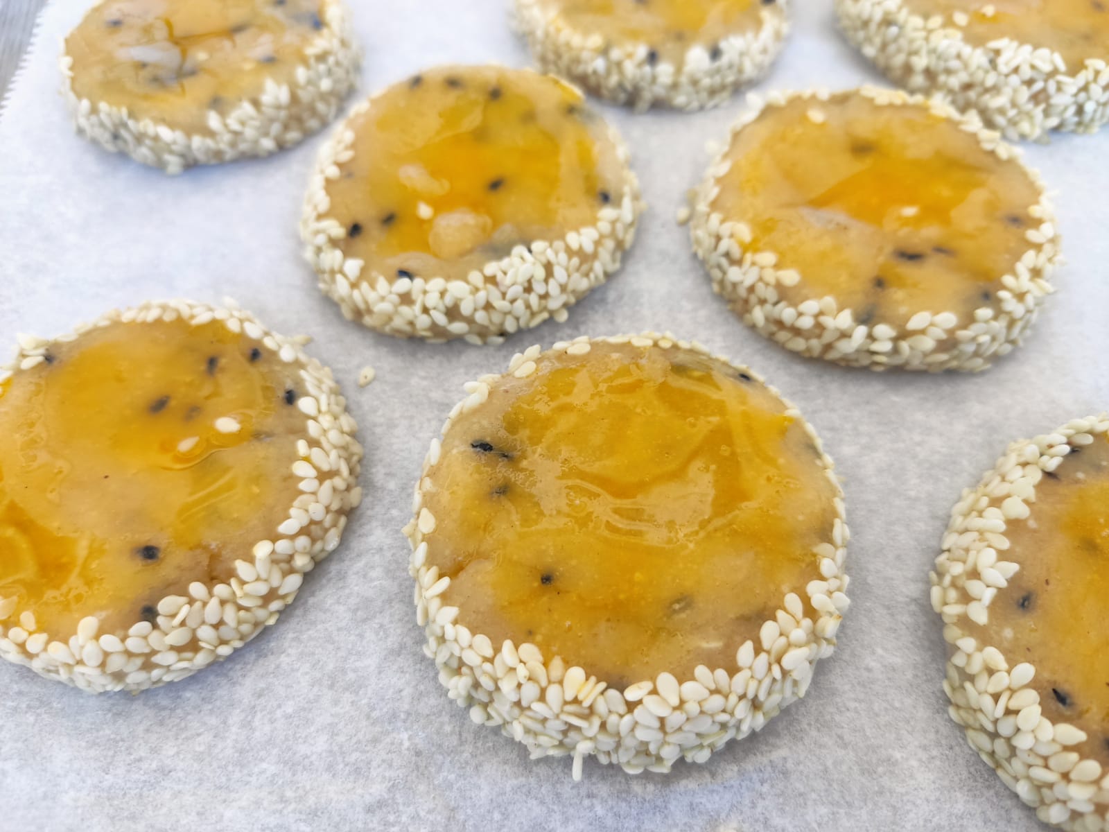 • İstediğiniz şekili verebilirsiniz ben en küçük bardakla yuvarlak şekilde çıkardım. Ve daha sonrasında yan kısımlarını önce yumurta akına sonrada susama batırıp tepsiye diziyoruz