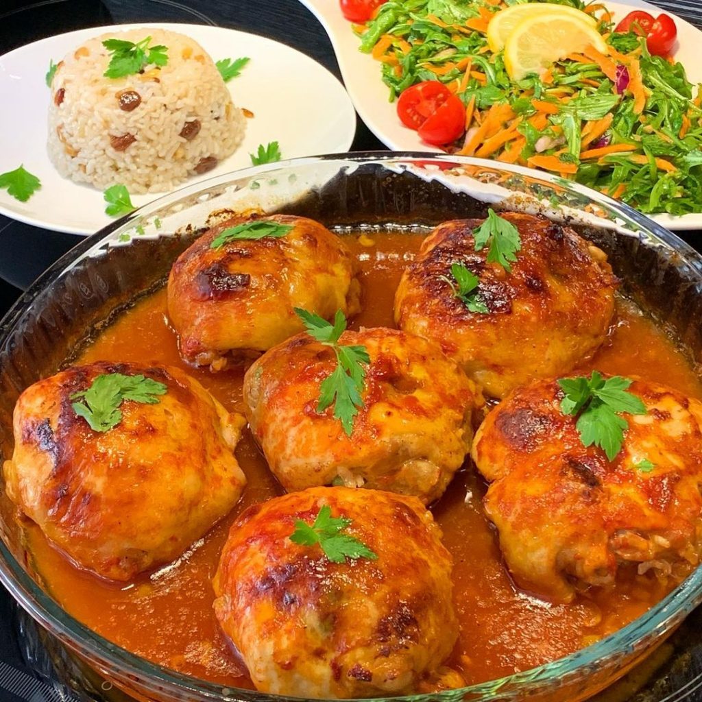 - Tavukların derili kısmı alta kalacak şekilde bir kasenin içine yerleştirin ve kenarından sarkıtın. İçine hazırladığımız pilavı 1,5 -2 kaşık pilavla doldurup kenarlarından sarkan tavukları üzerine kapatıp fırın tepsisine kaseyi ters çevirerek tavukları yerleştirin.